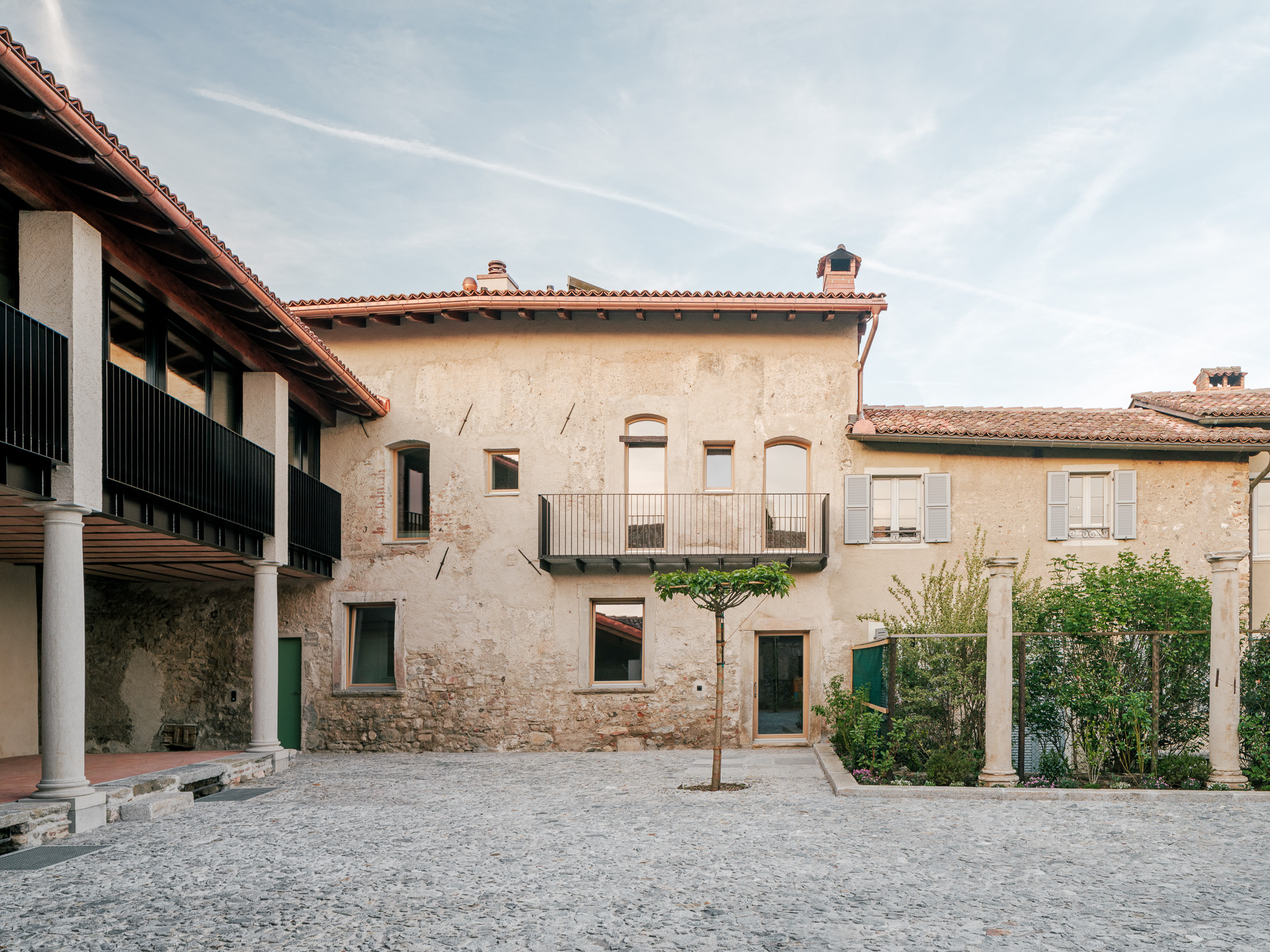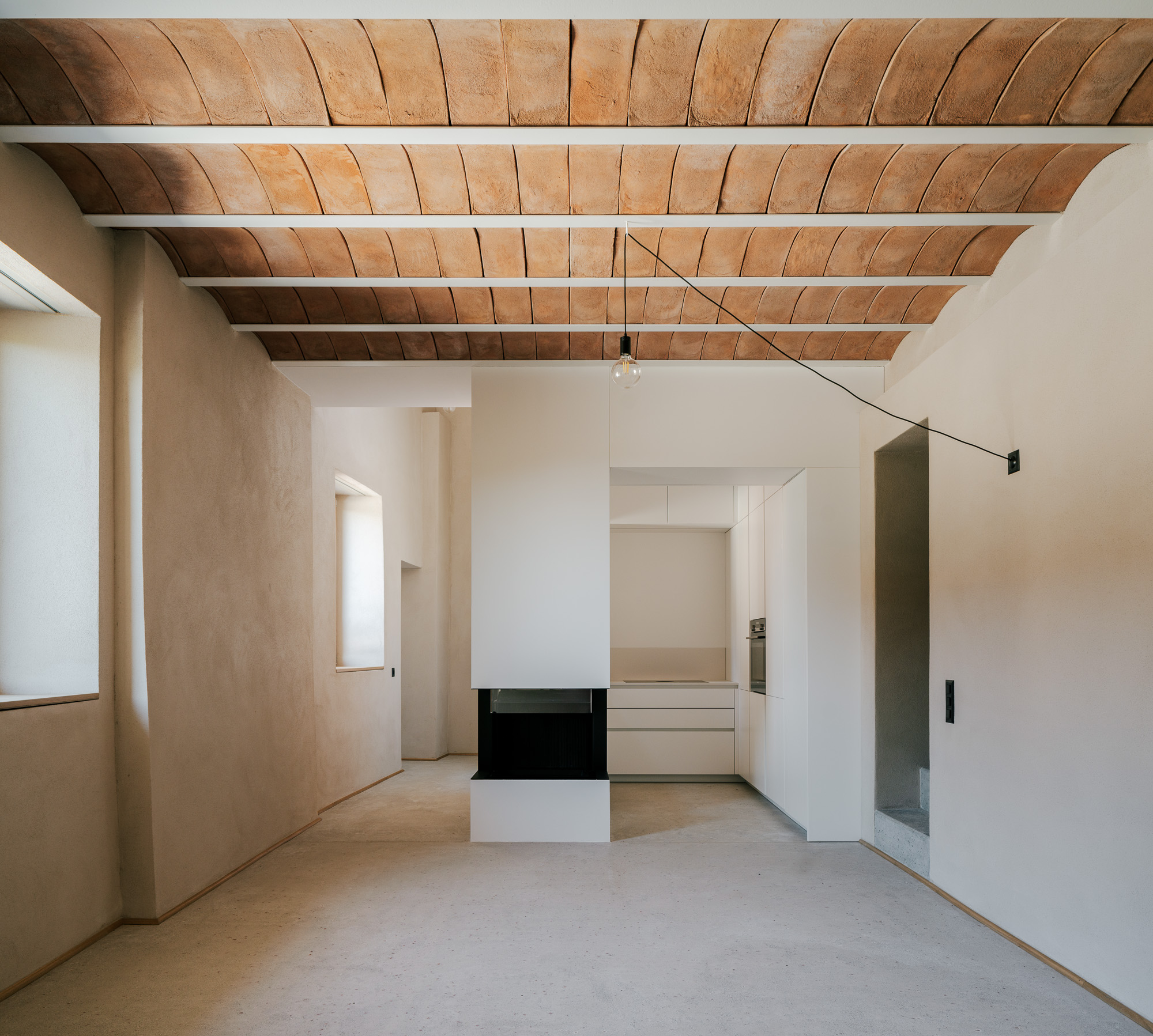 È stata recentemente consegnata Casa Bruno, una delle due unità abitative: l’appartamento si sviluppa su più livelli, con ambienti in relazione visiva e spaziale grazie a vuoti a doppia altezza. La zona giorno al piano terra è raccolta attorno a un camino centrale, e in questo livello è stata recuperata la tradizionale costruzione in voltini di mattoni, reinterpretata con un linguaggio contemporaneo che conferisce unicità e carattere allo spazio.