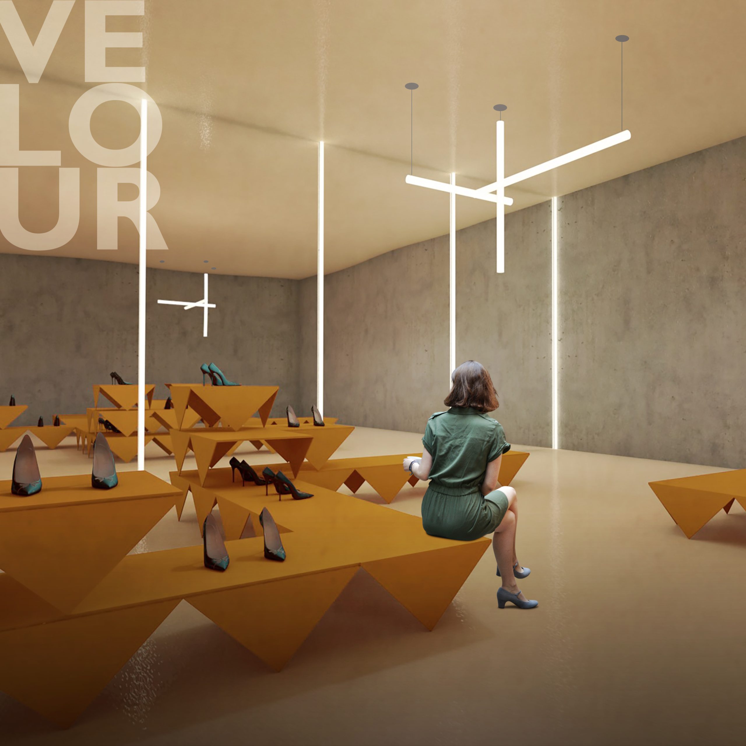 Il progetto per il negozio di scarpe di lusso in una località di montagna richiama le iconiche vette circostanti, ispirandosi alla forma triangolare alla base degli espositori. L’allestimento, concepito per essere flessibile, funge sia da seduta che da espositore per le scarpe, integrando funzionalità e design in modo armonioso.