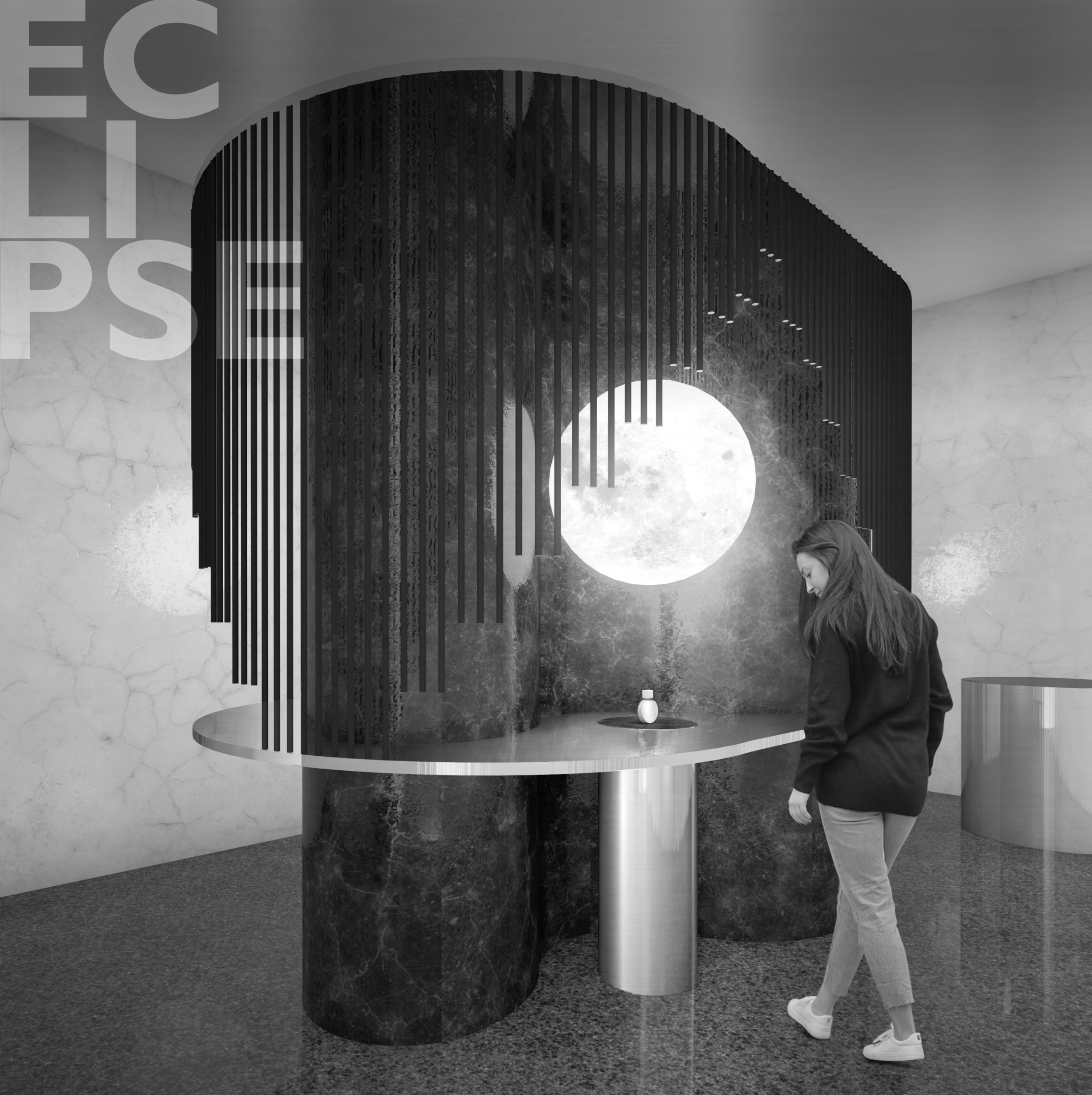 Il progetto per lo stand di “Eclipse” prevede l’allestimento di uno spazio fieristico standard di 4×8 metri, caratterizzato da una struttura sinuosa con tre nicchie illuminate da sfere luminose che richiamano la luna, ciascuna dedicata a una variante del profumo. L’alternanza delle forme crea un gioco di luci e ombre che evoca il nome del profumo, offrendo al visitatore un’esperienza immersiva e coinvolgente. I materiali scelti sono leggeri ed effimeri: il nucleo centrale in polistirolo rivestito con adesivo effetto marmo lucido e superfici in legno con finitura simil-acciaio. L’ambiente richiama un’atmosfera lunare e misteriosa, con toni scuri che evocano lo spazio, completato da sedute e un alto elemento di appoggio che orbitano attorno alla struttura centrale.